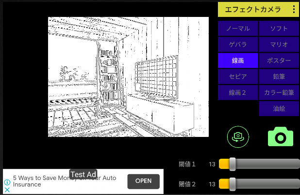 カメラの画像をリアルタイムに以下の10種類のエフェクトで表示して保存できます。