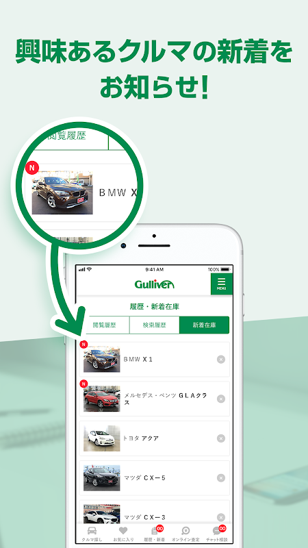 中古車をお探しならガリバーへお気に入りしたクルマの新着情報はプッシュ通知でお知らせ!わからないことがあれば、チャット相談からすぐにお問い合わせできます!