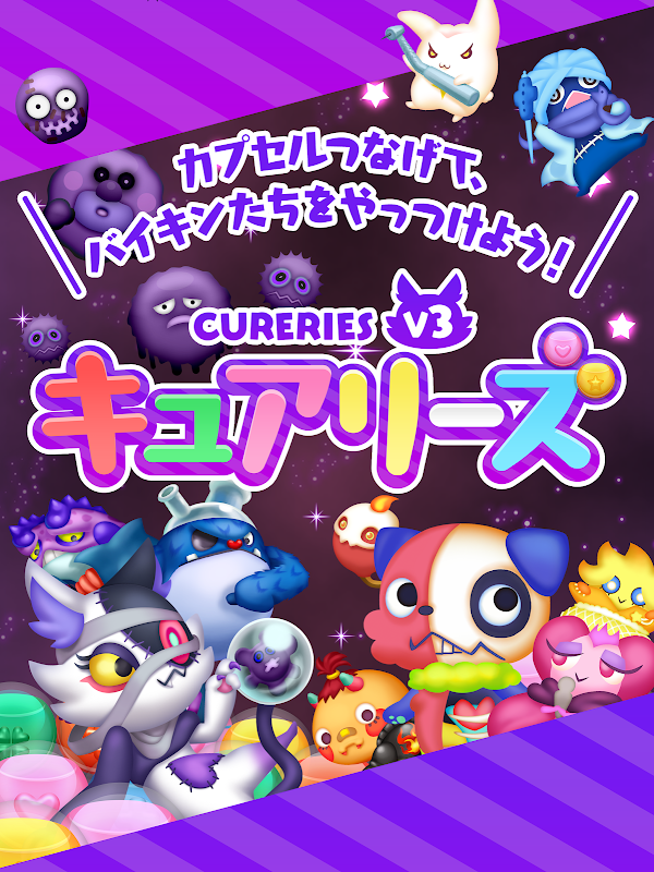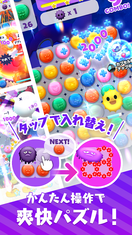 3つ以上繋げることでカプセルが弾け、バイキンを撃退できるぞ!