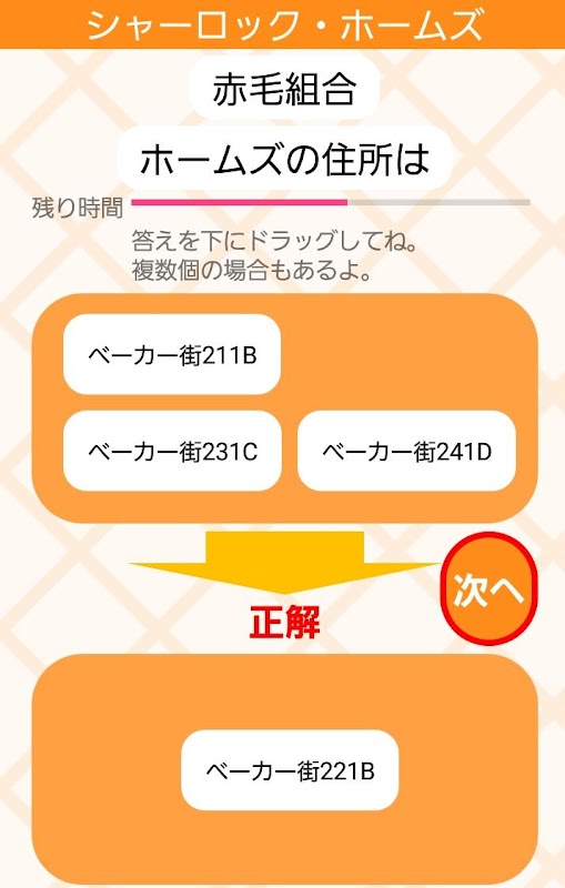不正解の場合は正しい答えが表示されます。そのため、繰り返し解くことで赤毛組合の内容を知ることができます。全問解き終わった頃には赤毛組合マスターになっていることでしょう。