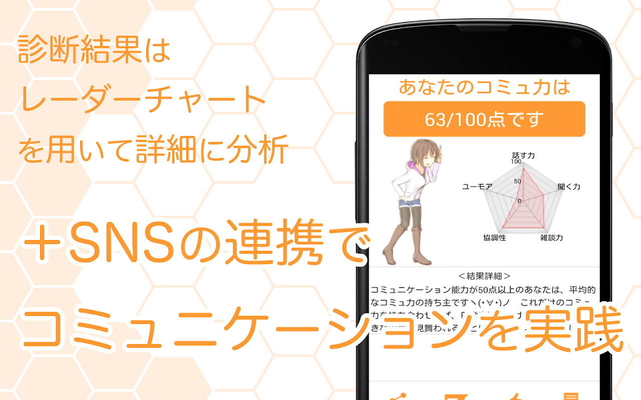 Dalam permohonan ini Berdasarkan di atas, ujian psikologi kecil dari kesemua 15 soalan dijawab dengan soalan secara rawak, keupayaan pengguna untuk berkomunikasi "bercakap kuasa", "kemahiran mendengar", "kuasa chat", "kerjasama", "jenaka dipecah bahagi dan menganalisis lima unsur-unsur ". Komprehensif mereka, untuk menjawab kuasa persefahaman anda adalah apa yang berapa banyak. Di samping itu, hasilnya kerana ia menggunakan carta radar pada skrin, untuk setiap parameter, apa yang apa yang tidak baik pandai, anda boleh menyemak sepintas lalu.