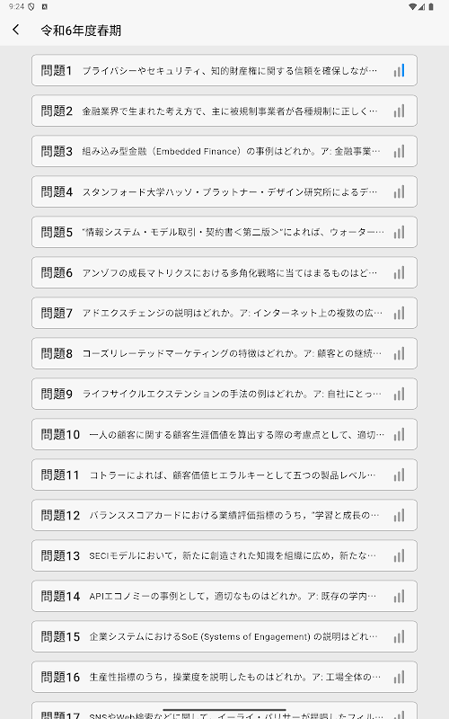 Anda boleh mempelajari soalan lepas dengan cekap dari bahagian pagi II peperiksaan IT Strategist. Anda boleh menghafal jawapan yang betul sehingga tiga soalan yang lalu. Mudah untuk menyemak soalan yang anda silap, dan penjelasan juga disediakan, jadi anda boleh menyasarkan untuk lulus peperiksaan IT Strategist dalam masa yang sesingkat mungkin.