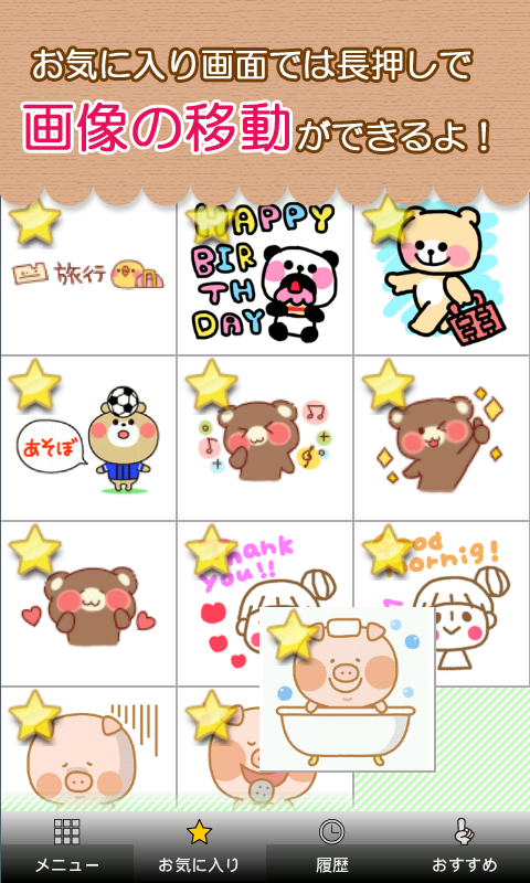 LINEなどでスタンプみたいに使える無料の画像集アプリです画像を選択して送りたいアプリを選択するだけの簡単操作ですお気に入りや履歴機能があって超便利!