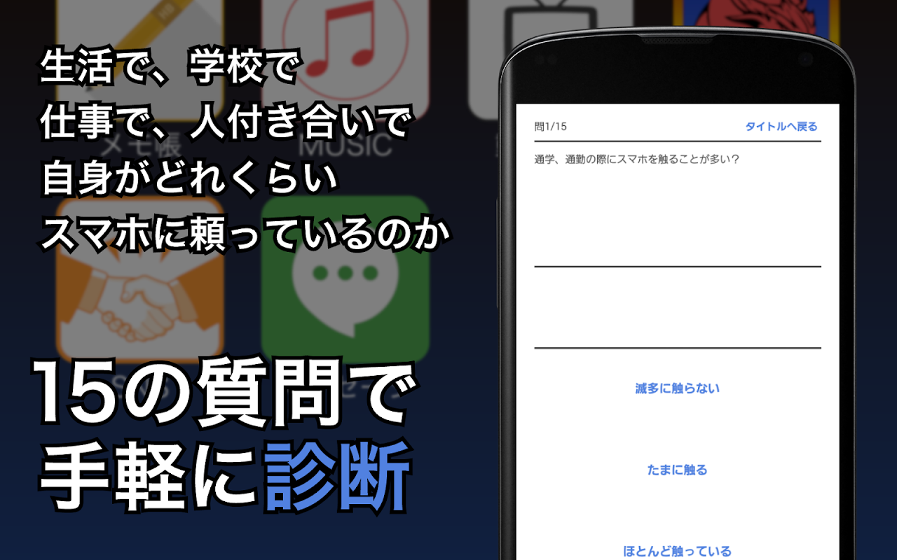 この診断アプリはランダムに出題される15問の質問や心理テストに答えるだけで、あなたがどれくらいスマホに依存しているのかを診断します♪♪