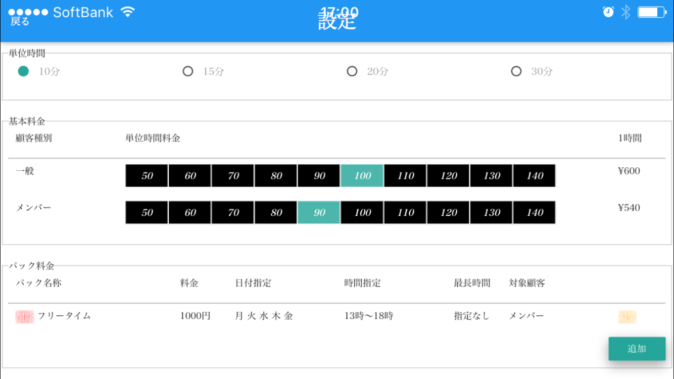 ※単位時間:10分,15分,20分,30分、1時間単価:150円,300円,400円,480円,520円,560円,600円,640円,680円,720円,760円,900円。それ以外は対応していません。