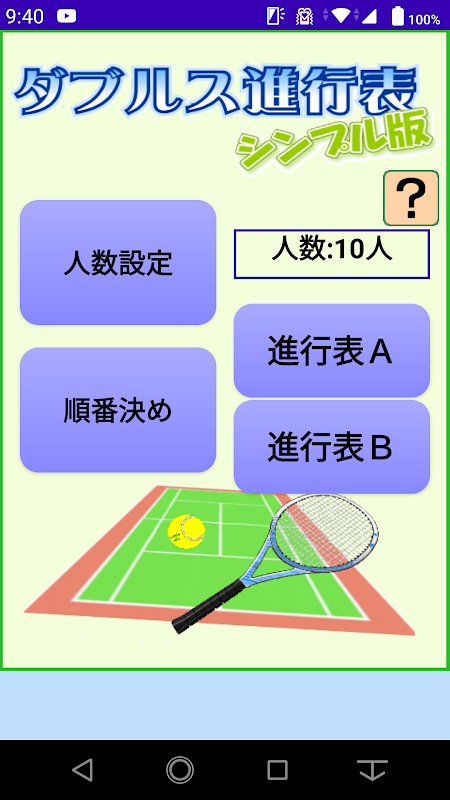 Ini adalah alat untuk maju ganda seperti tenis, dan tidak ada pengaturan atau input yang rumit, itu adalah aplikasi yang hanya menentukan jumlah orang dan memesan dan memeriksa jadual kemajuan.