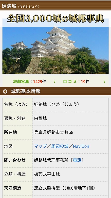 Semak imbas data asas, foto dan ulasan untuk 3,000 istana di seluruh Jepun. Terdapat lebih 50,000 ulasan dan lebih 400,000 foto istana. Gunakan maklumat ini sebagai rujukan semasa melawat istana, atau semak imbas maklumat dan foto untuk mencari istana yang ingin anda lawati pada masa lapang anda. Nikmatinya untuk pelbagai tujuan.