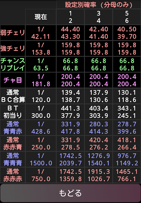 v1.0.6 通常G数を指定するのではなく、総G数(通常時・BTの合計)入力するよう変更しました。BT消化中も青青赤・赤赤青・青青青・赤赤赤のBCをカウント可とし、併せて理論値表に各出現率・合算表記追加しました。