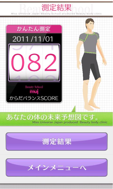 携帯電話を両手で首の下辺りに固定し側屈と体幹ひねりを行うだけで、ボディバランス(体の歪みや脂肪のつきやすい部位)の測定ができるアプリです。