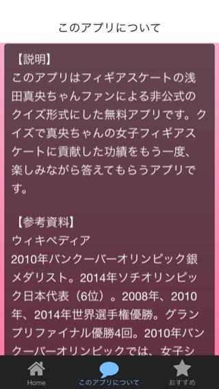 このアプリはフィギアスケートの浅田真央ちゃんファンによる非公式のクイズ形式にした無料アプリです。クイズで真央ちゃんの女子フィギアスケートに貢献した功績をもう一度、楽しみながら答えてもらうアプリです。