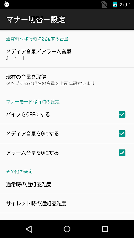 Ver2.0から、マナーモード設定時に音量のロックができるようになりました。