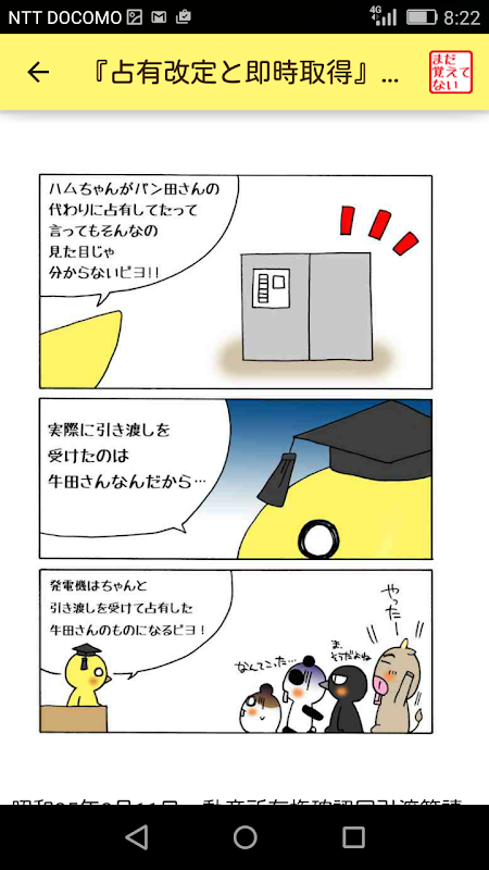 このアプリはよくある「マンガでわかる○○」とあるのに、実際にはマンガはオマケ程度でほとんど文章解説ばかりという本とは違い、民法判例の事実関係から、結論まで全てマンガにして分かりやすく解説します。マンガの他に簡単な文章解説も用意しているので、更に理解が深まります。