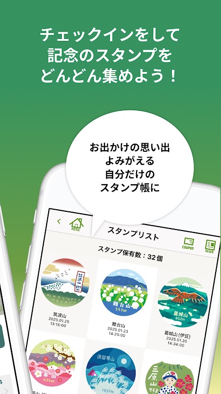 Menggunakan fungsi GPS telefon pintar anda, anda boleh mengumpul setem digital untuk memperingati mendaki atau mendaki gunung anda. Semua fungsi asas boleh digunakan secara percuma.