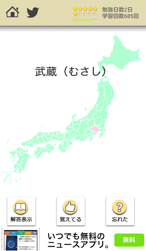 地図上で強調表示される場所の地名を暗記カードのように確認していくことで、旧国名を覚えることができます。