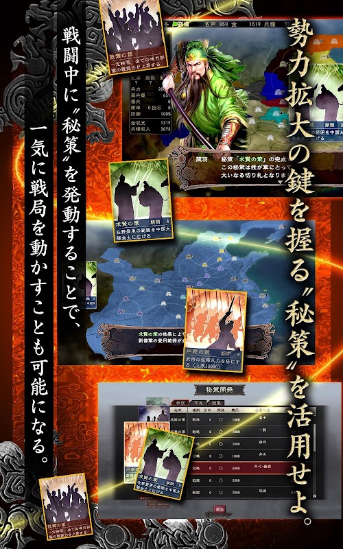 Gunakan pelbagai strategi rahsia untuk menjadikan pertempuran sebagai kelebihan anda, seperti "Strategi Merekrut" yang membolehkan anda merekrut komander tentera dari mana-mana sahaja di benua, dan "Strategi Menghubungkan" yang mengurangkan mobiliti semua unit musuh di medan perang Sho.