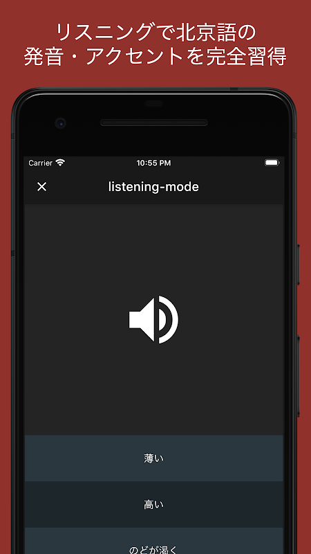 一般的な中国語単語を学習する教材はスペルを見ながら1つずつの語彙を確認していきますが、このアプリでは音声を聞き、それに相応しい日本語を選択するという形式を採用しているため、単語の意味を覚えながら同時にリスニング対策、発音・アクセント対策をすることも可能です。また北京語によるネイティブ音声を採用しているため、日本人特有のアクセントを抜け出し、将来、グローバルに活躍するための基盤を構築する事ができます。