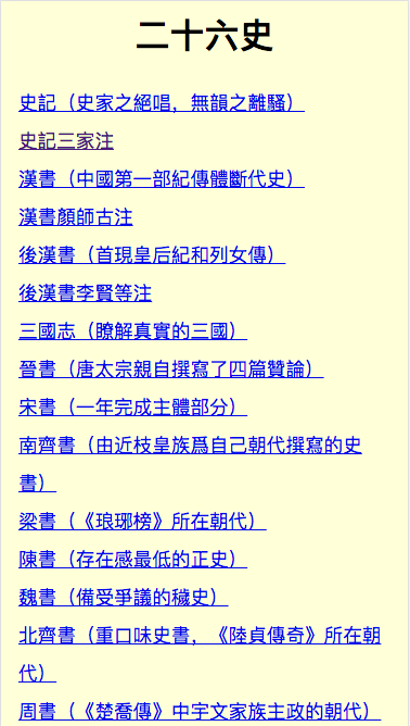 本應用收集整理了二十六史(二十四史+清史稿+新元史)及部分經典註解。自帶聽書功能,支持粵語和國語。
