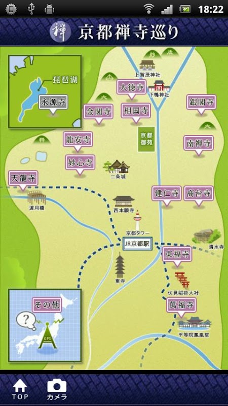 禅寺を征する者は京都を征す——こう言ってもいいくらい、京都の禅寺には名所が多い。京都観光として多くの方が参詣する金閣寺、銀閣寺、龍安寺、高台寺などの有名寺院や、通天橋からの紅葉が大人気の東福寺もすべて禅寺。これらの寺院を含めた87ヶ寺を案内する、歴女や仏像ガールにも必見の至れり尽くせりなAndroidアプリです。