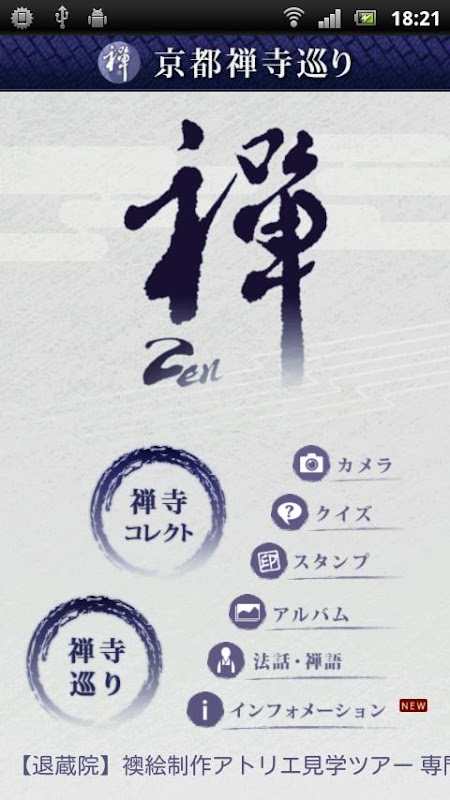 中国で生まれた禅は、鎌倉時代に日本にわたって我が国独自の禅の文化を創り出しました。禅文化研究所にて作成した「禅クイズ」で、そういった禅の歴史や禅の文化についての知識をユーザーに問いかけます。興味深く気軽に禅の知識を理解・習得でき、京都観光の予習・復習にも役立ちます。
