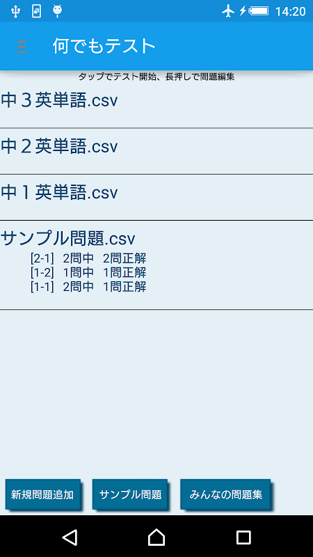 Ini adalah aplikasi alat hafalan yang membolehkan anda menguji rentetan watak format CSV (nilai yang dipisahkan dengan koma) pada telefon pintar anda. Terdapat juga alat penyuntingan soalan yang membolehkan anda berkongsi soalan dengan orang lain.