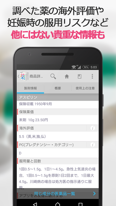 Ini ialah apl Android yang mengandungi keseluruhan pangkalan data ``Hoken: Buku tentang pemahaman ubat yang diberikan oleh doktor, edisi ke-33.'' Kami memberikan maklumat yang anda perlukan untuk menggunakan ubat dengan selamat untuk kira-kira 13,000 ubat yang biasa ditetapkan.