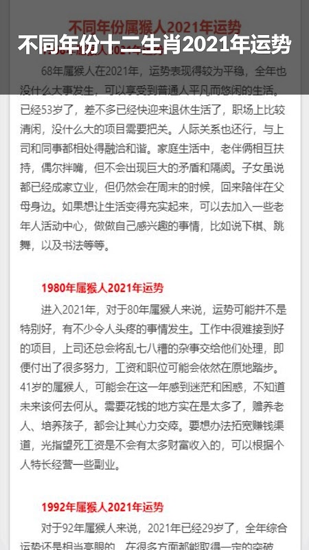 此 , 此 APP 还有 不同 年份 十二生肖 在 2021 的 年 运势 和 每个 月份 的 十二生肖 详细 解说。