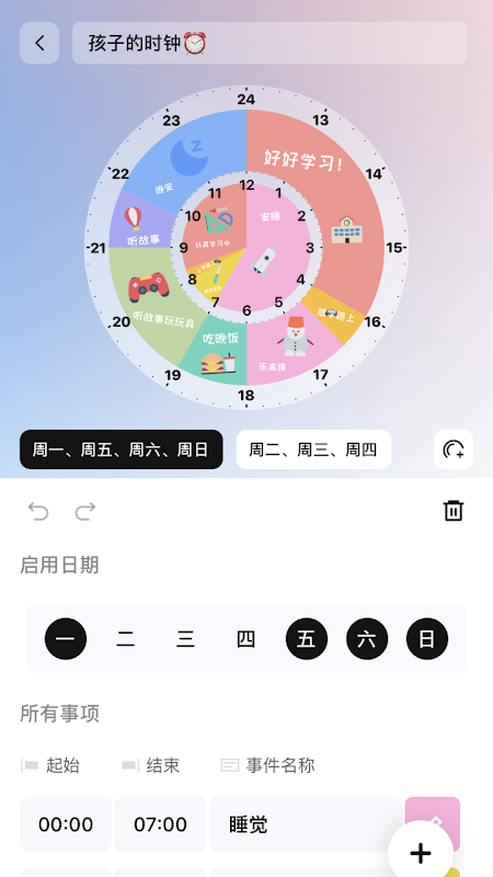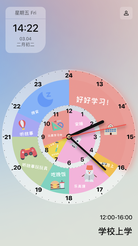 ● Ambil kanak-kanak sekolah di atas sebagai contoh: susunan selepas sekolah adalah titik utama penyusunan harian kanak-kanak, yang dibentangkan pada cincin luar jam cincin dua. Waktu tidur adalah agak tetap, dibentangkan pada cincin dalaman jam dua cincin.