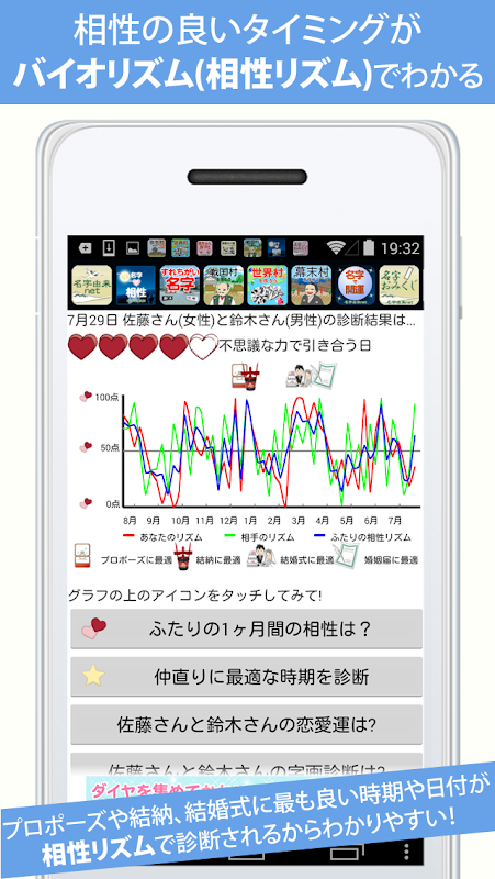 - Anda boleh mengetahui masa dan tarikh terbaik untuk permohonan, pertunangan, perkahwinan dan penyerahan pendaftaran perkahwinan menggunakan bioritma (irama keserasian). Hari-hari terbaik dipaparkan, dengan mengambil kira Rokuyo (Rokuki), seperti Daian. Dengan menggunakan fungsi "Pemberitahuan Masa Baik", yang membunyikan penggera pada masa terbaik, anda boleh mengetahui masa terbaik dengan pasangan anda tanpa ketinggalan.