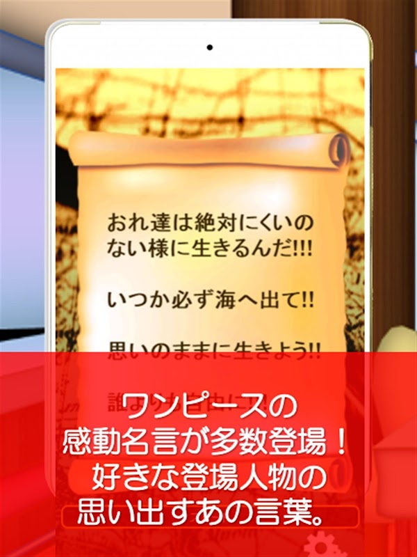 ワンピース(ONE PIECE)に登場する名言・名シーンが蘇る名言集。歴代登場人物から約400種のセリフが登場する非公式無料アプリです。