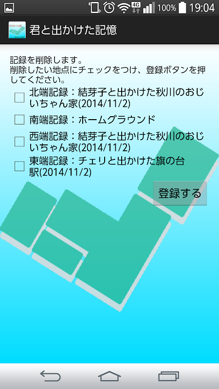 あなたが端末を起動した場所が、あなたにとって「最北(東南西)端」だったときにその記録を残せます。一緒に行動した「誰かさん」との思い出日記として活用ください。
