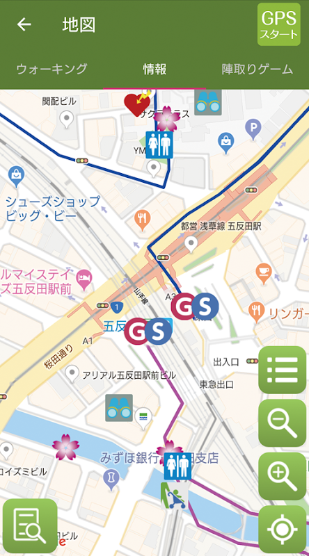 品川区の指定スポットに行くと、アプリ内で「陣取り」が可能です(GPS機能有効時のみ)