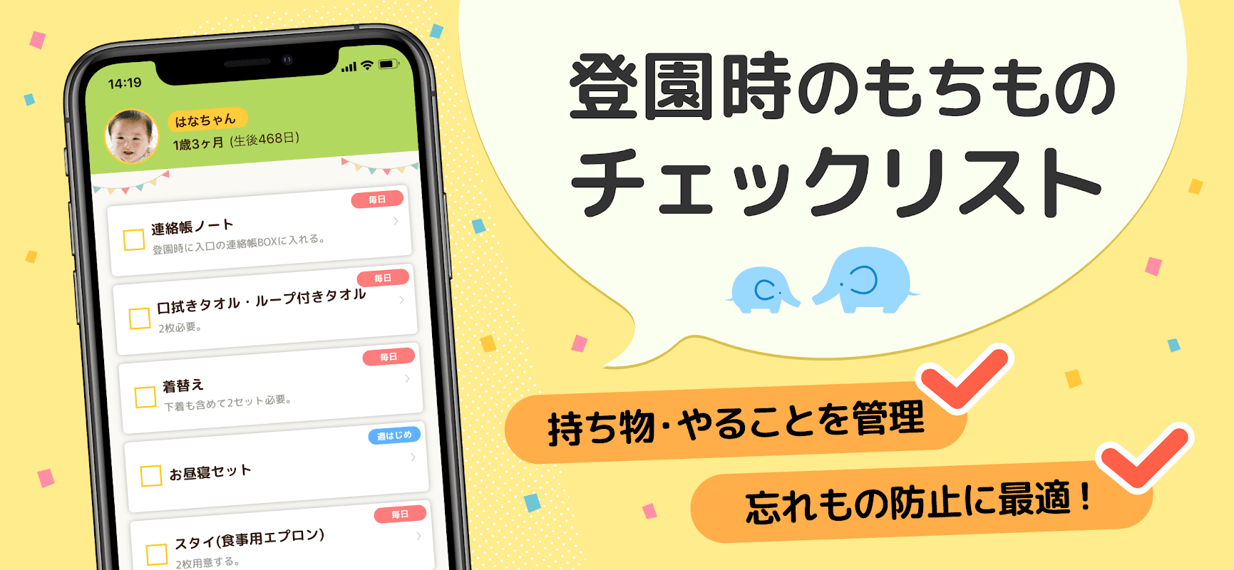 「登園が始まってからの日々準備することをチェックリスト化して忘れ物防止を行う」管理アプリです。