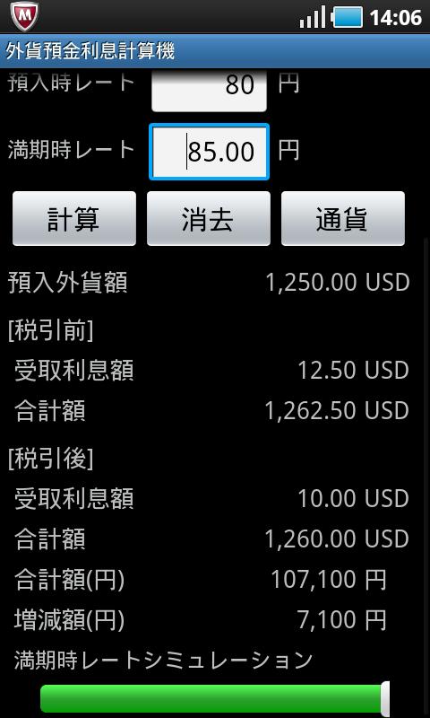 ・外貨預金利息計算機は、金額、金利、預入期間、預入時レート、満期時レートから、外貨預金の受取利息額を計算するアプリです。