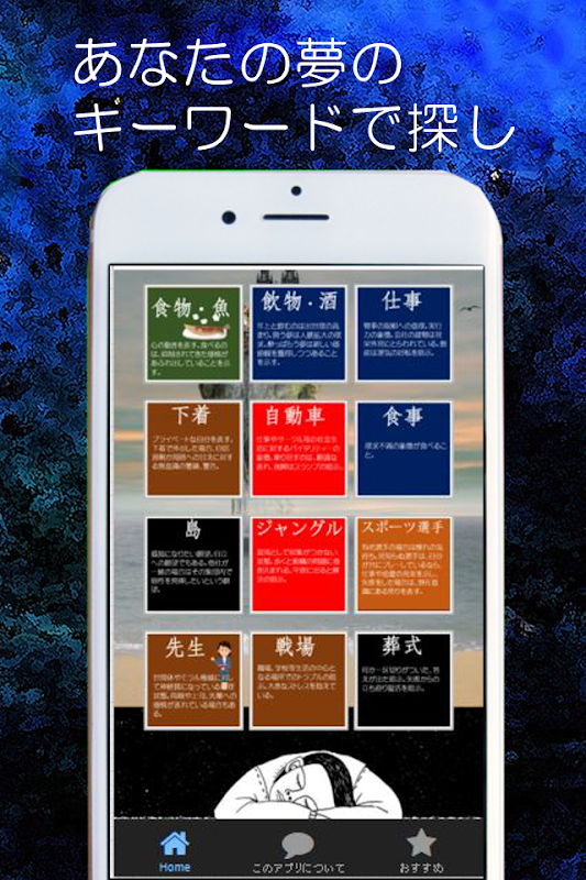 ゆめうらない診断辞書無料アプリ。夢の意味夢は恋愛、仕事、人間関係、健康の問題において深層心理の一端を違った形で表現してくれます。夢分析は前向きな生活に役立ちます