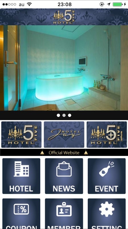 大阪市中央区(難波・日本橋)のラブホテル HOTEL FIVE(ホテル ファイブ)、大阪市阿倍野区(天王寺)のラブホテル HOTEL FIVE+(ホテル ファイブプラス)の公式アプリです。お部屋では大画面テレビでVOD(ビデオ・オン・デマンド)見放題、フリーWi-Fiも完備しているので大阪の観光旅行などで是非ご利用ください。光る浴槽HOTARUを備えた特別なお部屋も!アプリ限定のお得なクーポンやお知らせを配信します。