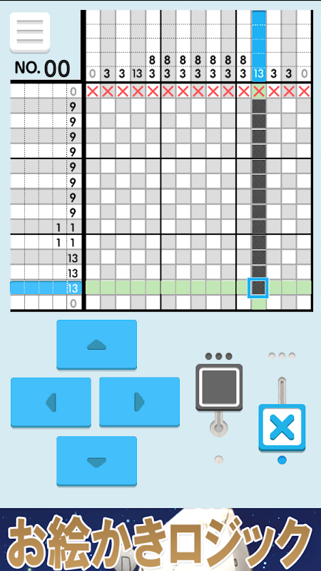 数字のヒントを元に、マスを埋めて隠れた絵を探り当てるパズルゲームです。