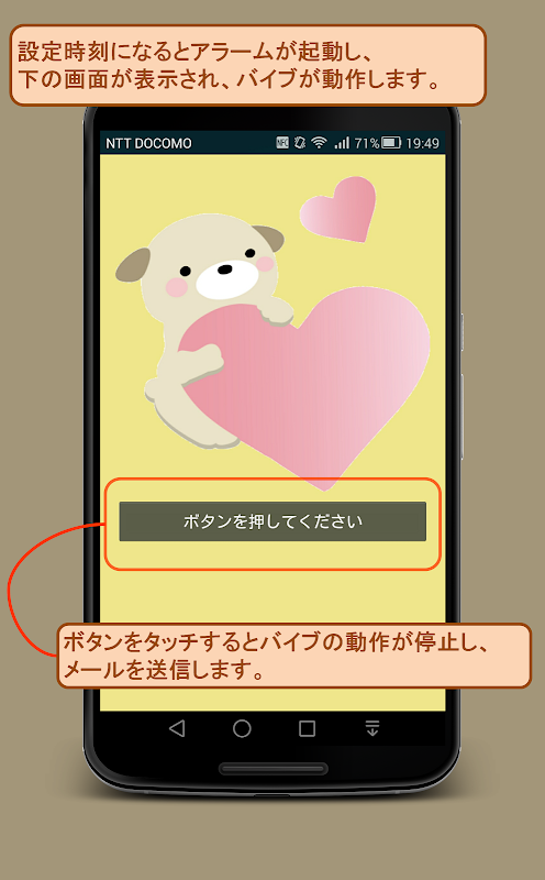 設定した指定時刻に一日一回指定時刻にバイブ起動とともにアラームが動作します。