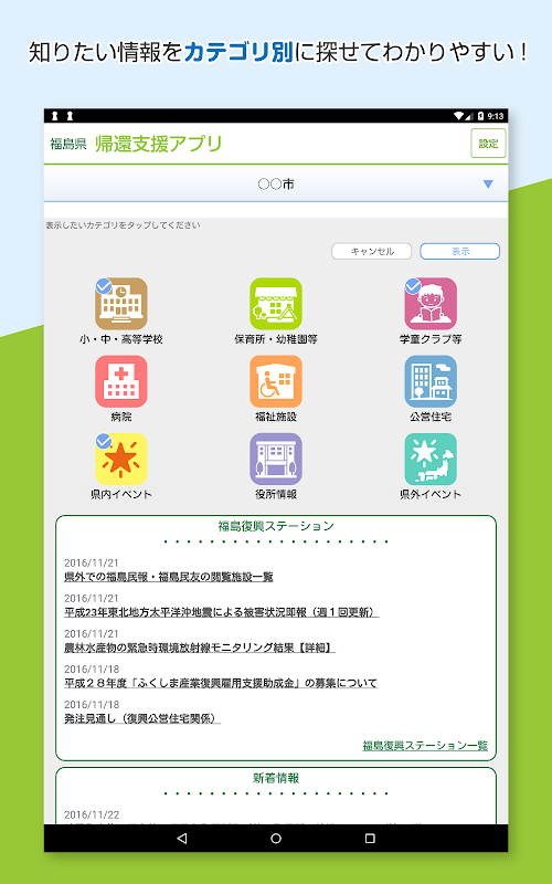 このアプリは福島県が提供するアプリです。アプリは、避難地域12市町村とその近隣で避難者の受け入れや自主避難者の多い18市町村の住民の方へ、帰還を支援する情報やふるさとの情報を伝える内容となっています。