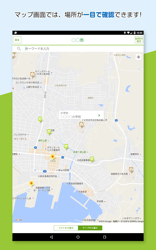 アイコンを選択した場合、地図上にその施設などの位置がシンボルで表示され、さらにシンボルを選択すると詳細情報(住所、電話番号、施設の説明など)が確認できます。