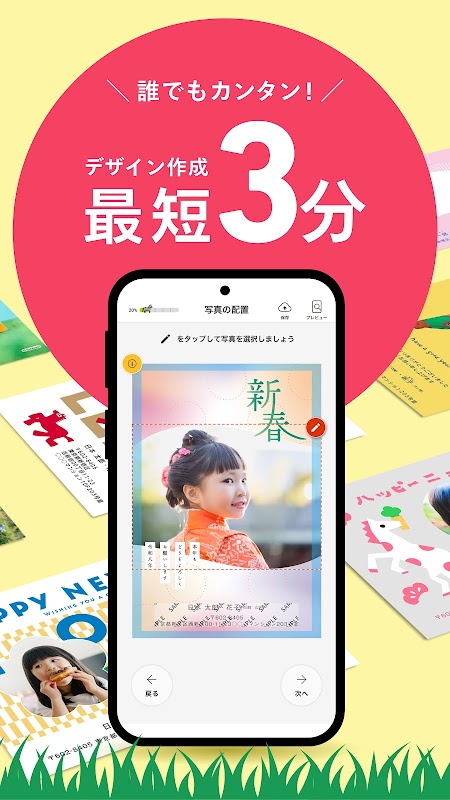 写真・差出人・メッセージ・スタンプを1ステップずつ進める簡単編集画面で、デザイン作成最短3分!