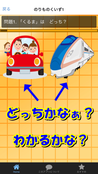 子供が大好きな「はたらくくるまやのりもの」の名前を、二枚の画像の中から当てていくクイズです。非常にシンプルなクイズですが、お子様の教育には役立つかなと思い制作してみました。 子供さんが退屈にしている時や何かの待ち時間に、また子供さんがグズっている時など、非常に便利だと思います。もちろん親御様と一緒に楽しむ事も出来ると思いますので気軽に、何回でも楽しみながら出来るクイズアプリとなっています。