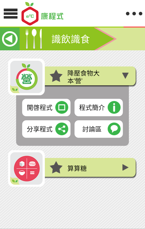 識飲識食—有關飲食資訊的應用程式,提供與高血壓健康飲食的食物成份分析庫,以及換算出食物中醣質分量的計算工具。您可以透過此程式記錄每日飲食,了解食品中的成份,包括食物當中的營養價值等,並進行分析,有效於降壓及控制血糖。