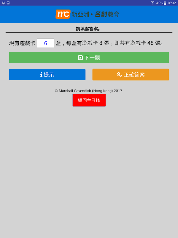 學生作答完畢,可選擇「檢查答案」,看看自己的答案是否完全正確。如是正確,稍後便會自動出現另一題應用題;如是不正確,學生可再次作答直至正確為止,或者選擇「正確答案」來觀看正確答案。