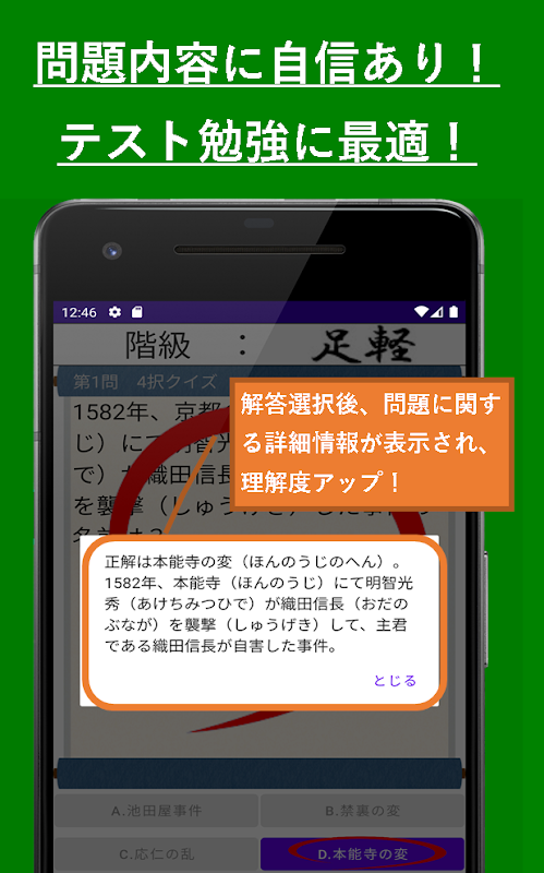 Maklumat terperinci akan dipaparkan dengan cara yang mudah difahami selepas menjawab, jadi jika anda menyelesaikan setiap soalan, anda pasti akan mengenali sejarah Jepun dengan aplikasi ini!
