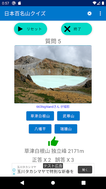 Kuiz meneka nama gunung dengan 4 pilihan daripada gambar 100 gunung terkenal di Jepun