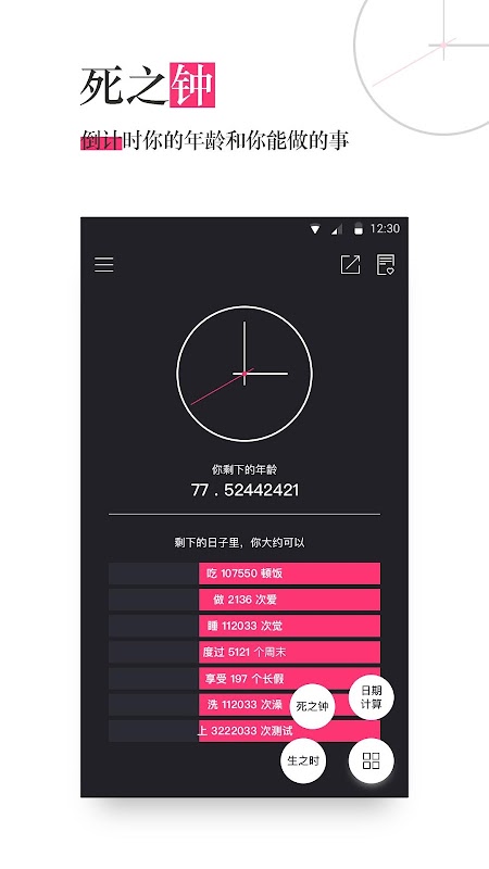 用时间简记,在死之钟选择预测寿命,死亡时钟自动估算您还可以度过多少个周末,还可以陪伴父母多少次,生命倒计时让您珍惜每一天。