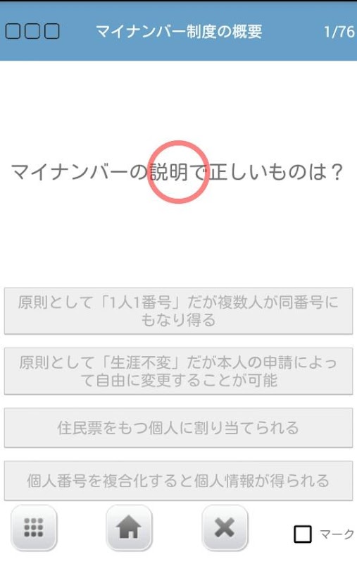 マイナンバー検定は公式問題集が存在しないため、テキストベースで学習をすることになります。そこで四択で電車の中でも手軽に学習できるアプリを作成しました。