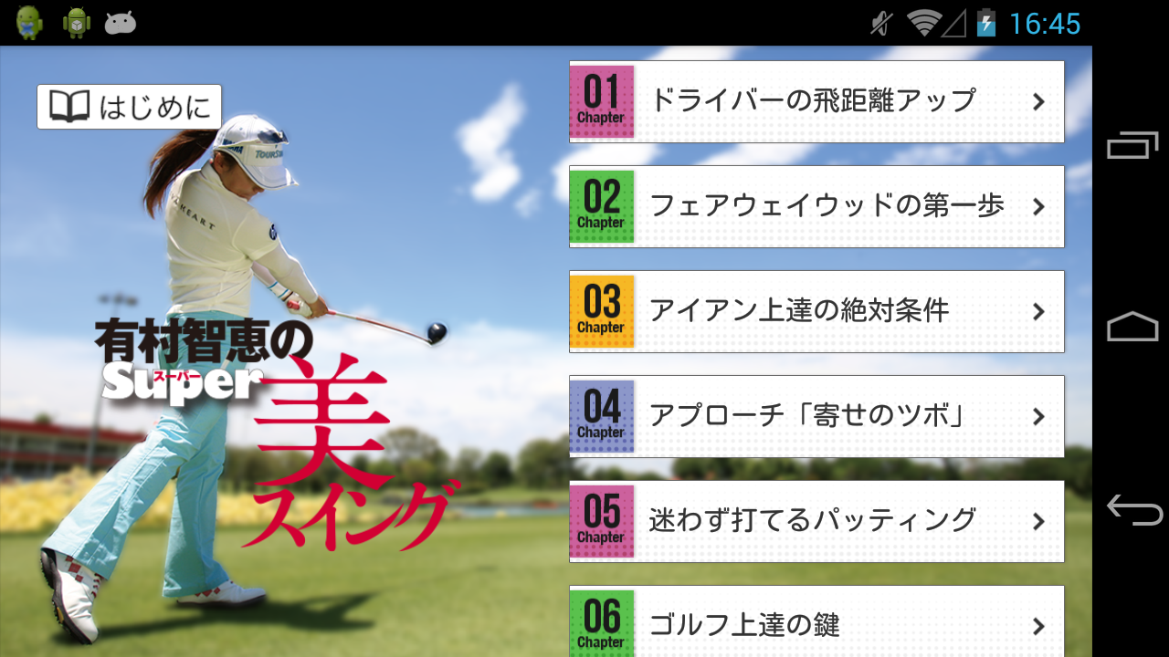 女子プロゴルファーの中でも"美しい"と定評のある有村智恵のスイングを見ながら、アマチュアが上達するための秘訣を解説。ドライバーからパターまで、ビデオブックアプリで"美スイング"を手に入れよう!