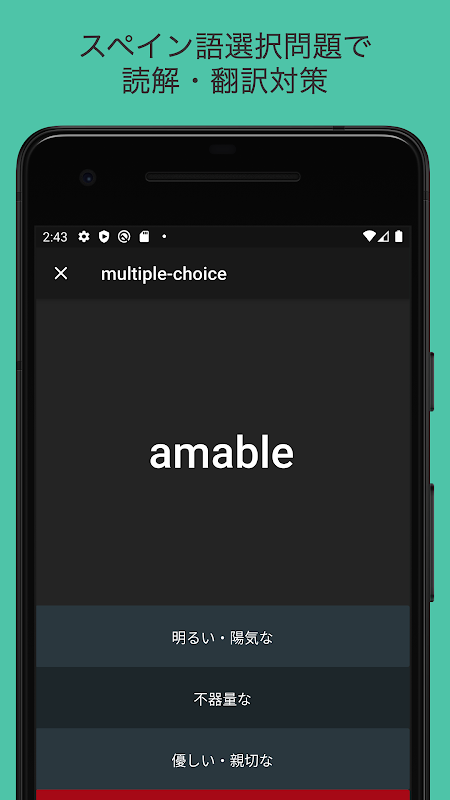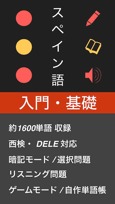 スペイン語学習者(初級〜中級)にとっての重要単語を学ぶためのアプリです。約1600語収録、スペイン語検定(西検)6級〜4級、 DELE:A1〜B1