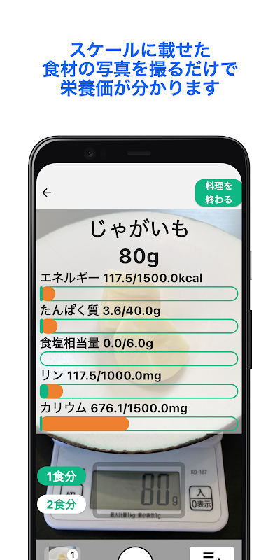 はかりに載せた食材の写真を撮るだけで自動で栄養計算ができます。
